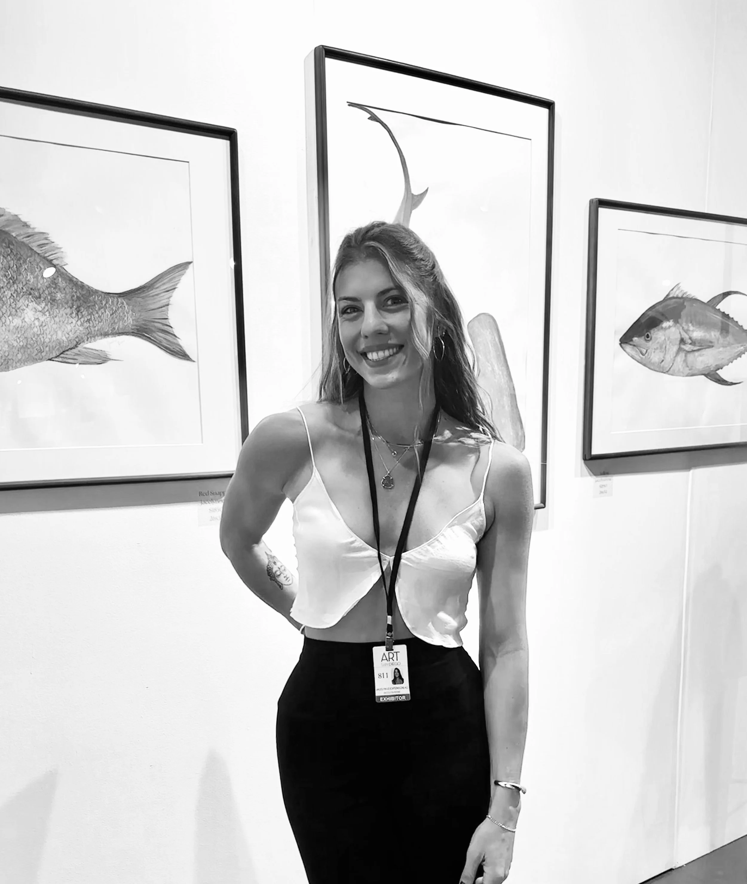 Jacelyn is a watercolor and Gyotaku artist whose creative voice has been shaped by years spent freediving, spearfishing, and living intimately alongside the waters of Florida’s Gulf Coast and the Florida Keys. Each descent beneath the surface, each encounter with marine life, informs her understanding of form, movement, and reverence. This proximity gives her work an authenticity and emotional depth that extends far beyond aesthetic representation.