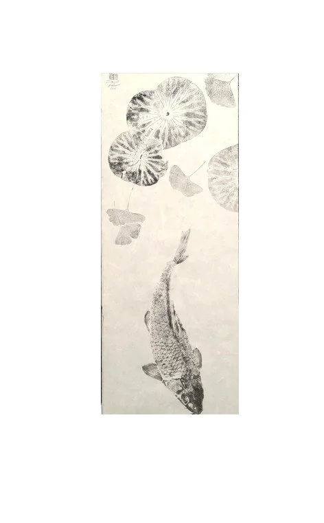View fullsize Koi Swimming Among Lily Pads & Ginkgo Leaves Artist: Dwight HwangDimensions: H37” x W12”